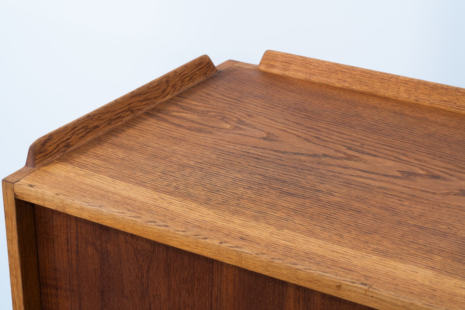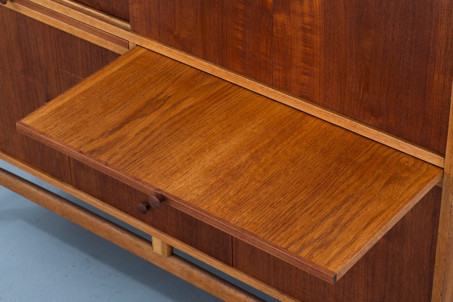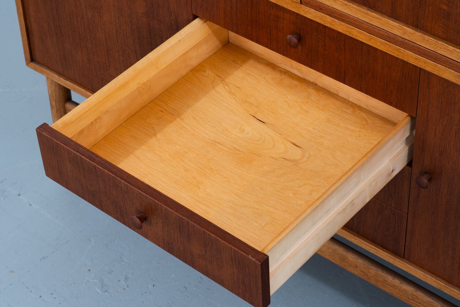 チークの深みとオークの明るさが織りなすコントラスト。丸い小さな取っ手は、指先にしっくりと馴染む、控えめな句読点のようです。