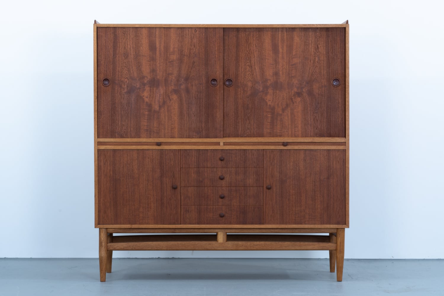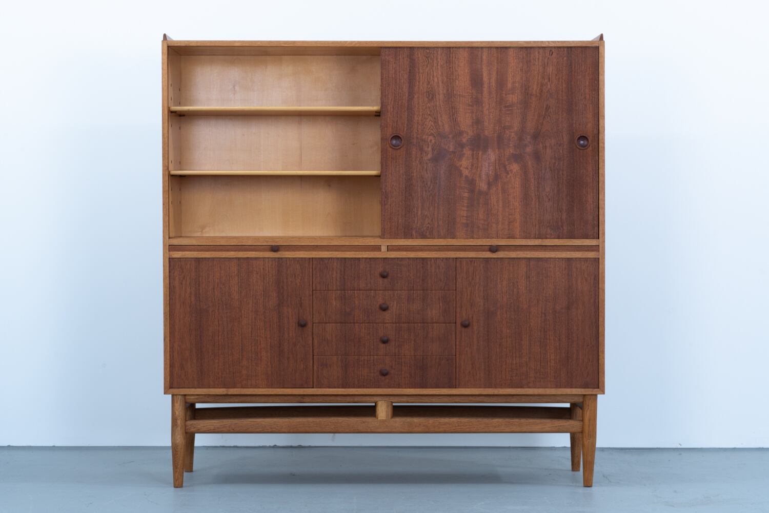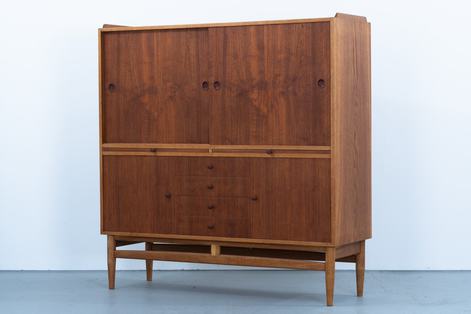 チークの深みとオークの明るさが織りなすコントラスト。丸い小さな取っ手は、指先にしっくりと馴染む、控えめな句読点のようです。