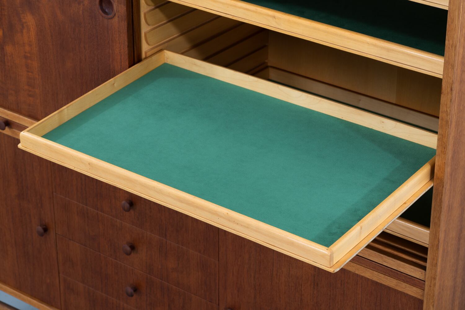 扉を引いた瞬間、思わず息を呑むのは、内側に隠された一面のグリーン。深い木の色の奥に広がる、まるで「秘密の草原」のような鮮やかな色彩は、大切なカトラリーや宝物をひとつひとつ、特別な舞台に載せてくれるような高揚感を与えてくれます。