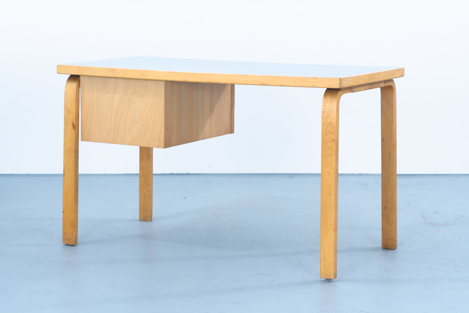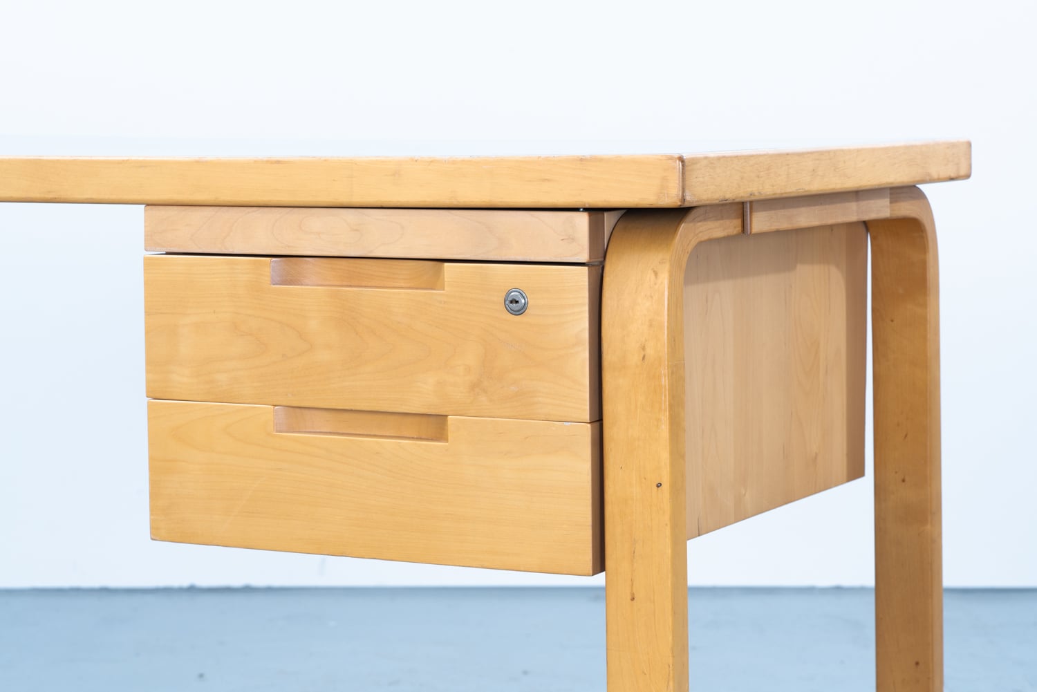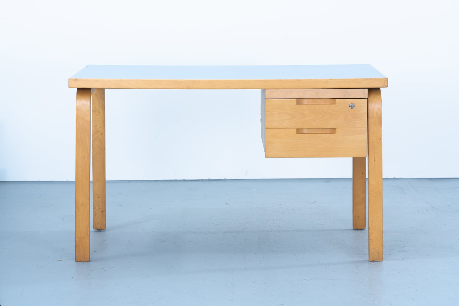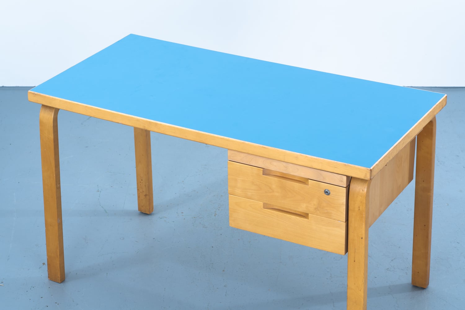 1970-80年代に製造されたこのデスクは、その完成されたシステムに、実用的なドロワーユニットを組み込んだ一台。特筆すべきは、バーチ材の柔らかな飴色と鮮やかな対比を描く、ブルーの天板です。当時の北欧デザインが持っていた、実用の中にある遊び心。この「色の温度」が加わるだけで、無機質になりがちなワークスペースに、一変して豊かな知性が漂い始めます。