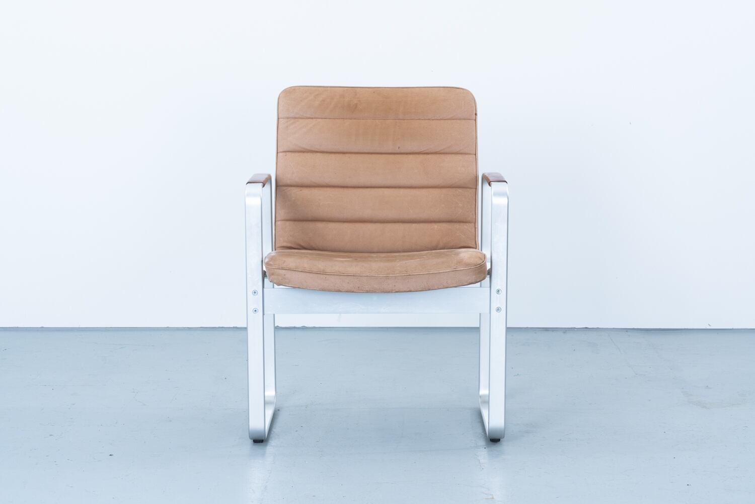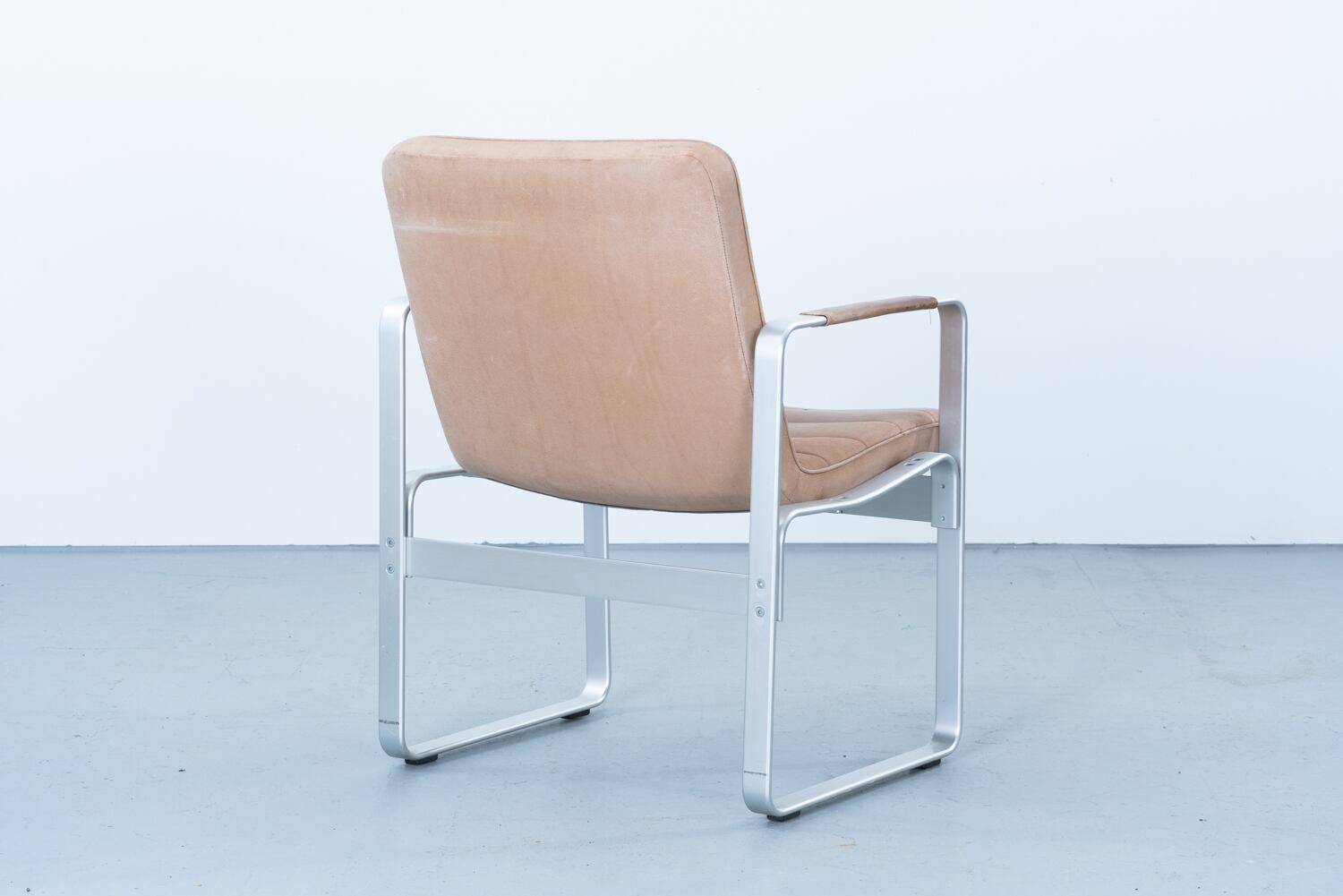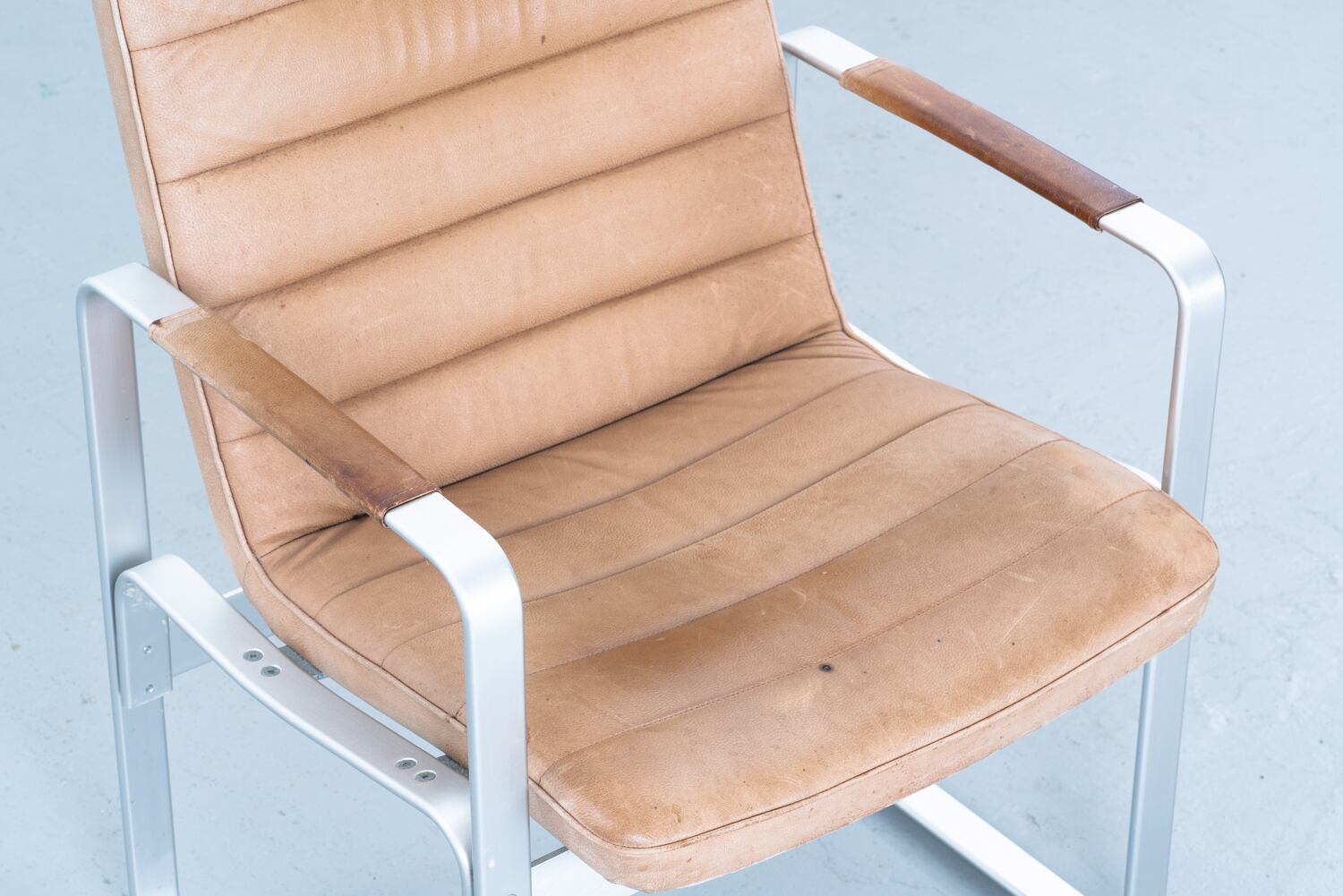 最大の見どころは、空間を切り裂くようなソリッドなアルミのライン。スレッドベース(そり脚)が生み出す視覚的な軽やかさは、重厚になりがちなラウンジチェアの概念を鮮やかに覆しています。そこに組み合わされるのは、水平に走るステッチがリズムを生む、肉厚なヌメ革のシート。