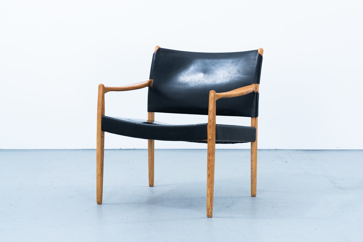 吸い込まれるようなブラックのシートと、こっくりと色づいたオーク材のフレーム。そのコントラストは、まるで深煎りの珈琲に一滴のミルクを落としたときのような、静かで、けれど強い意志を感じさせる美しさを湛えています。